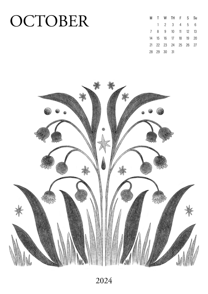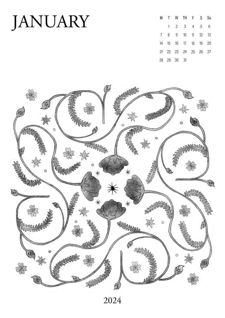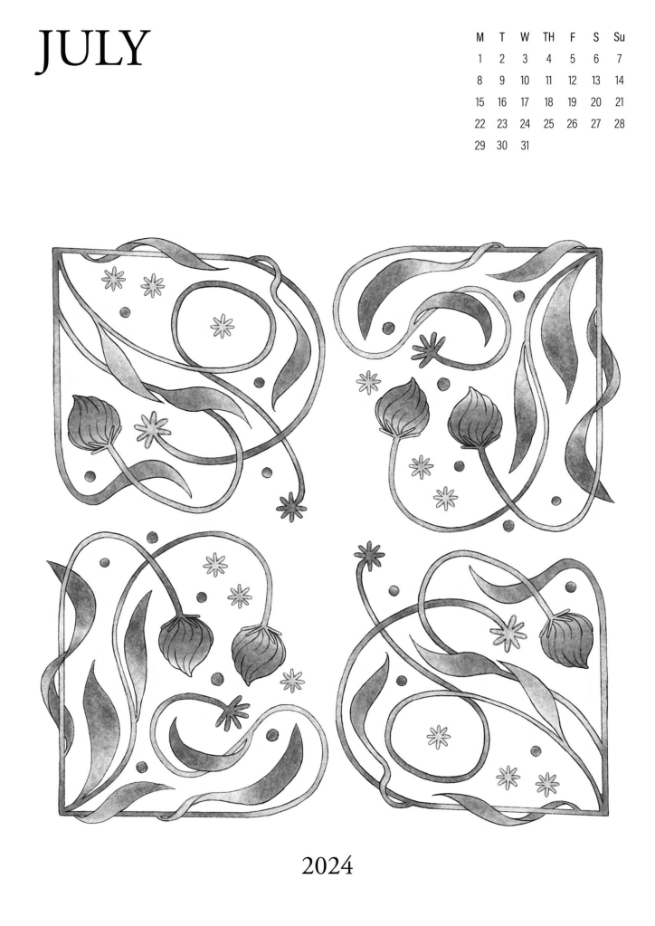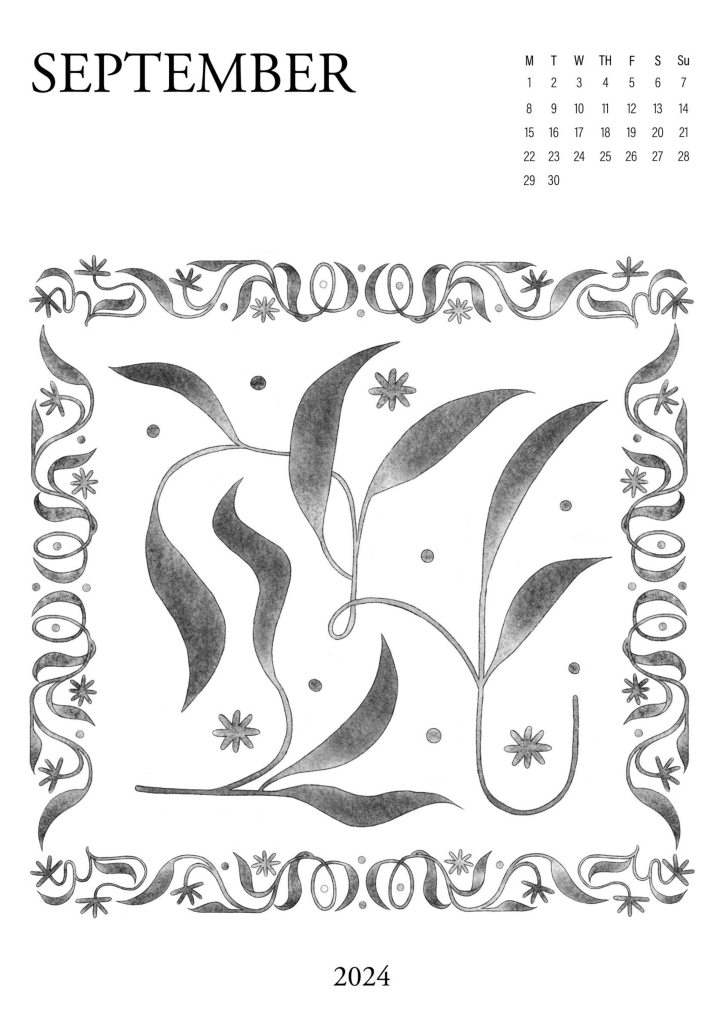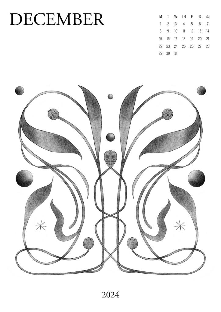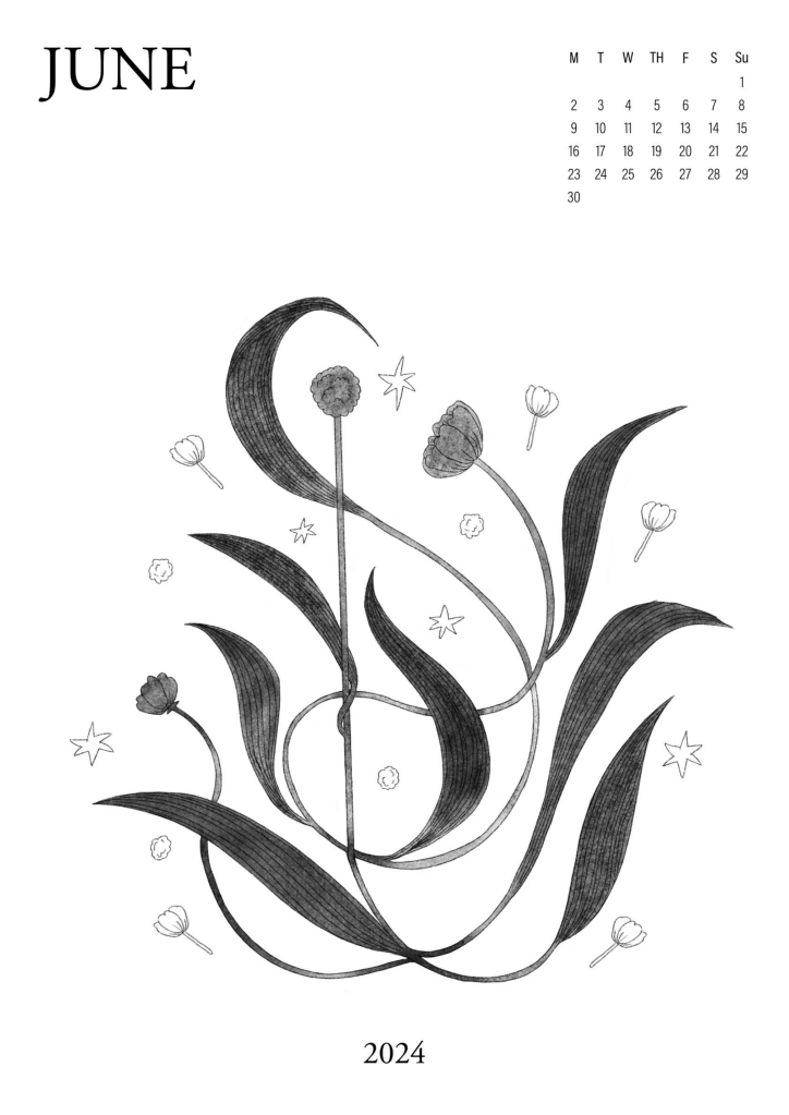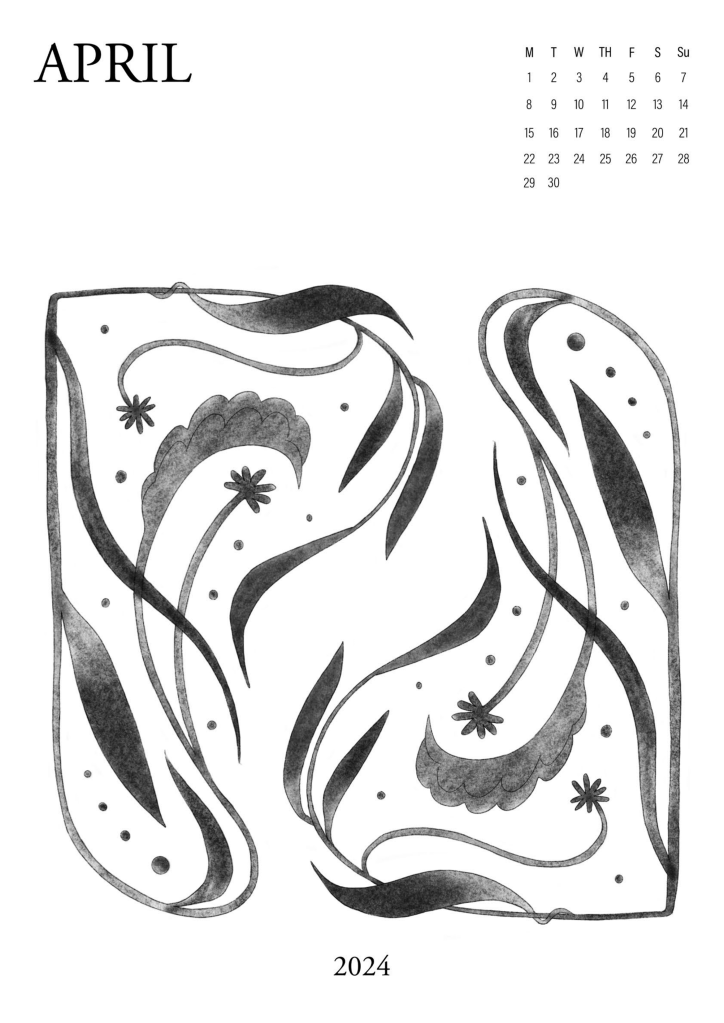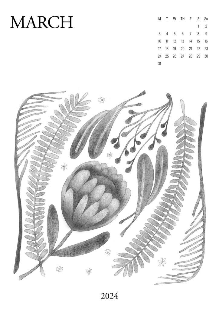 A series of abstract floral illustrations, partially organised by the Australian seasons. Using graphite & charcoal textures, soft gradients and stark grayscale contrasts. Subtly gridded letters & numbers form a simple monthly calendar.