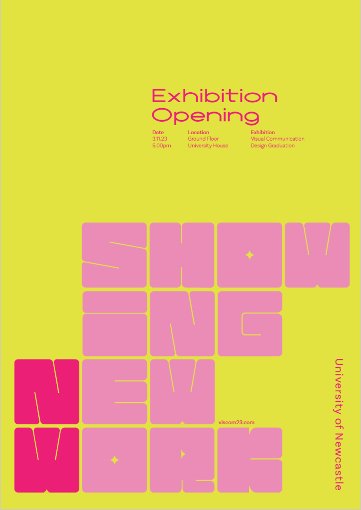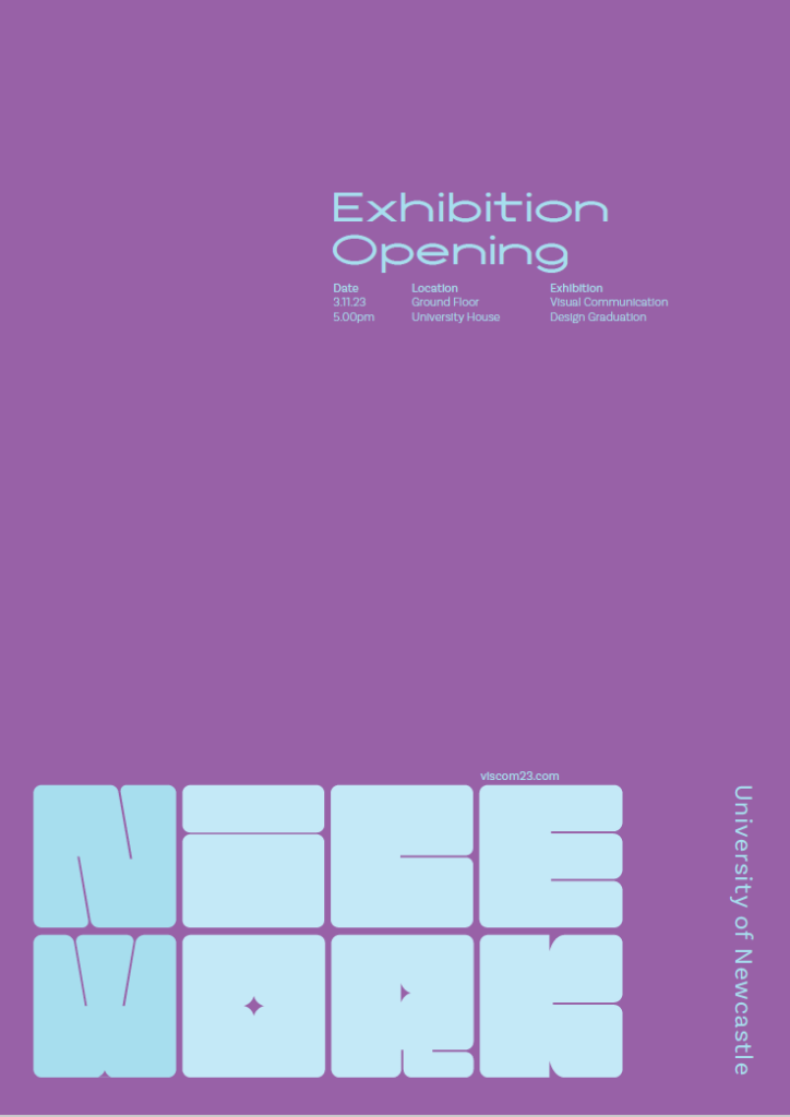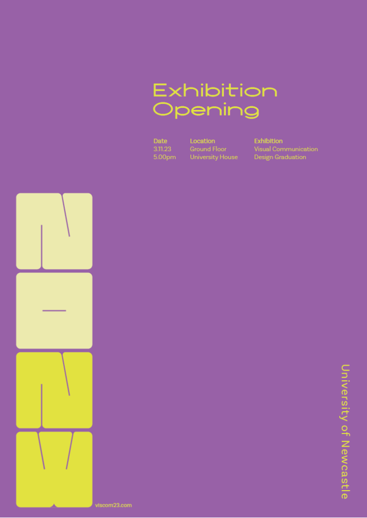 The initial idea for the Grad Show’s visual identity was centred around the letters ‘N’ & ‘W’ looking like a ‘2’ & ‘3’ on their side, representing the year of graduation. This project was completed by myself and two other UON students, Ash Dibbs and Cassidy Motum.