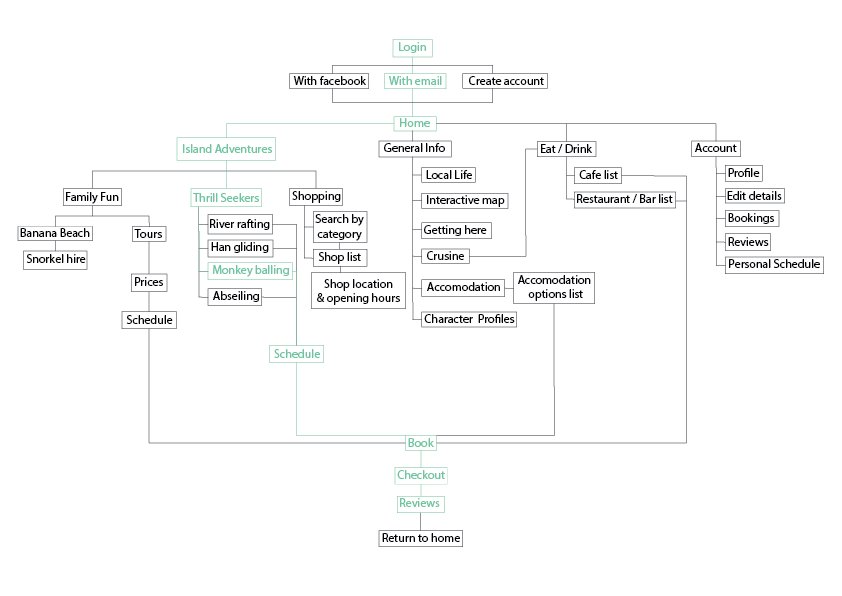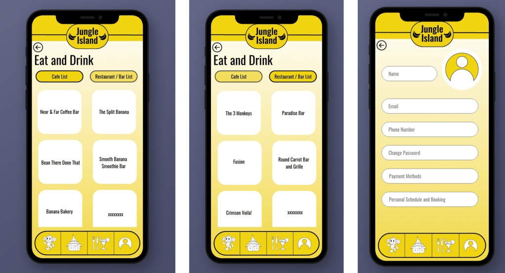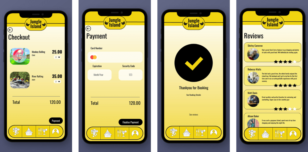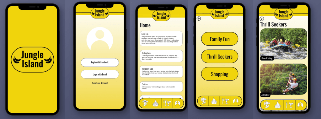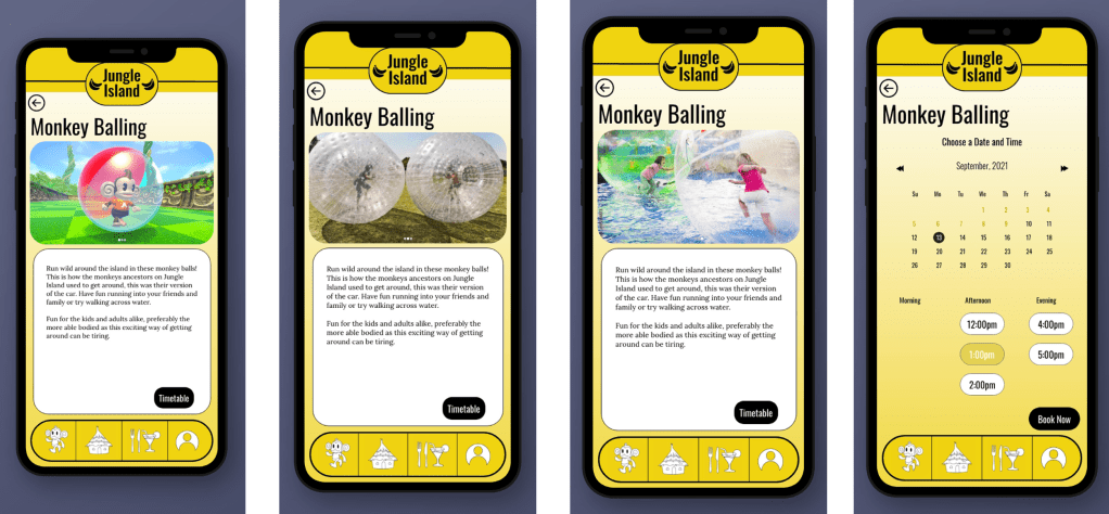 Jungle Island is an app prototype developed for a fictional tourist destination based on the game, Super Monkey Ball Adventure. It was designed to promote the island and aid the user organise and manage their stay, providing information about the island, available activities and a booking system. It was designed to be an easy navigation system for the wide range of users.
